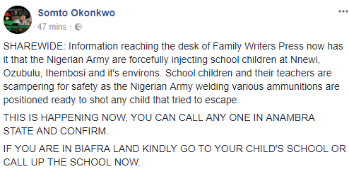 It was reported that some people in military uniform arrived a school in the area and started forcing them to take injection which led to the death of 3 pupils from yet-to-be identified school.