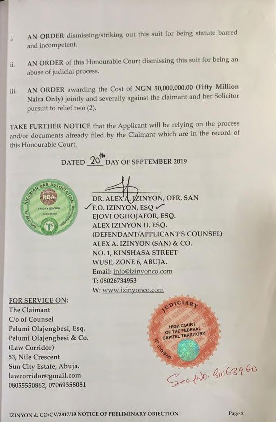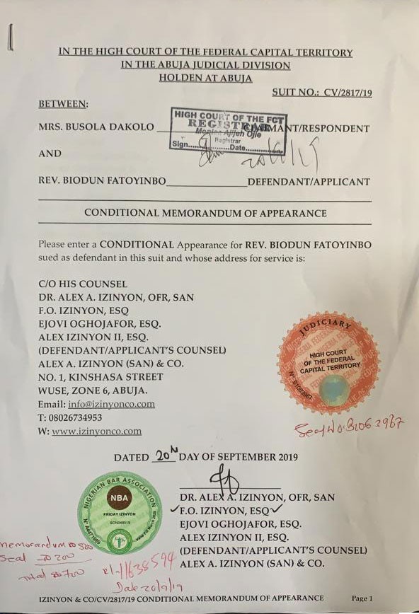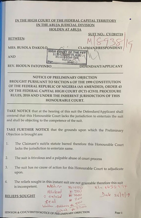 Pastor Fatoyinbo filed the objection notice before Federal High Court, two weeks after Busola through her lawyer Pelumi Olajengbesi, approached same court, demanding for a clearly worded apology on the front page of at least two national newspapers and two national television stations for seven days running consecutively.