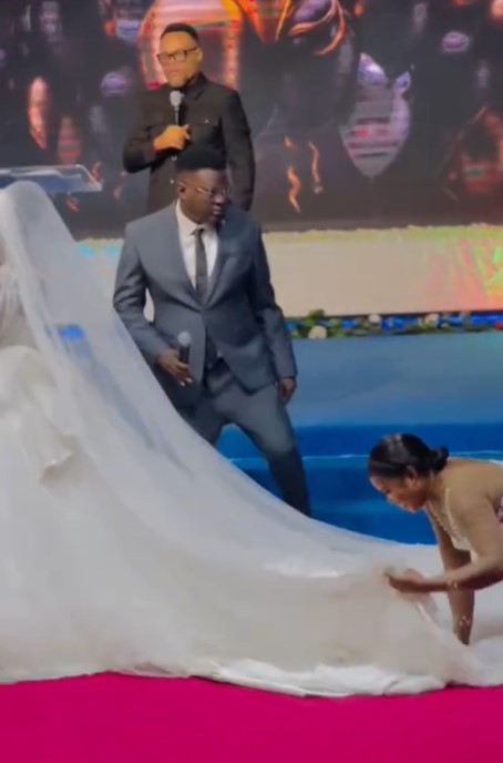 In a video posted by @yungadexvisuals, the bridesmaid crawled and kneeled to straighten the bride’s wedding gown while the couple stood before the altar, ready to be declared husband and wife by the pastor.