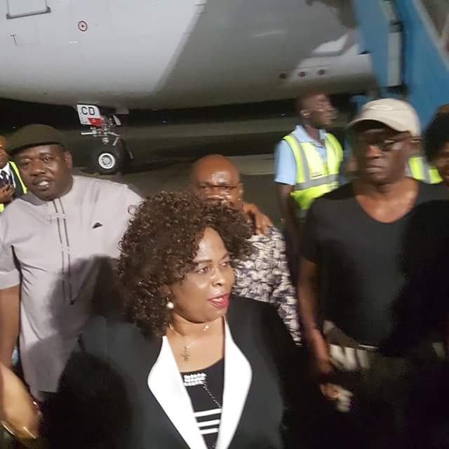 Ex-first lady, Patience Jonathan was photoed wearing bright smiles as she arrived at the Port Harcourt International Airport, yesterday, after a short vacation abroad.