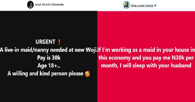 Among those who found the pay offensive is a Facebook influencer by the name of Brian Jonah Dennis who gave a counter-post saying, “If I’m working as a maid in your house in this economy and you pay me N30k per month, I will sleep with your husband”