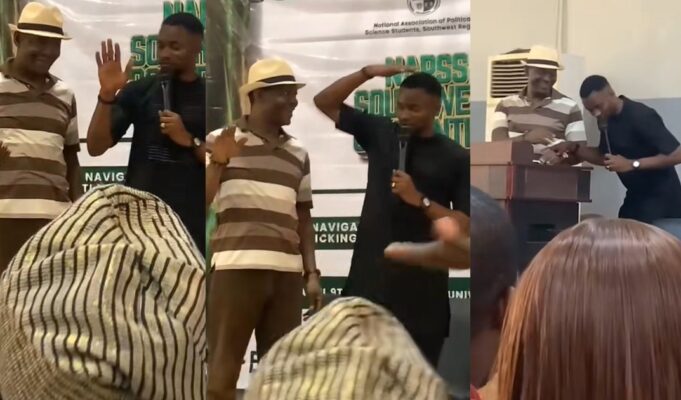 Hilarious moment an MC taught a university professor how to dance the trending ‘Moro Dance’ (WATCH)