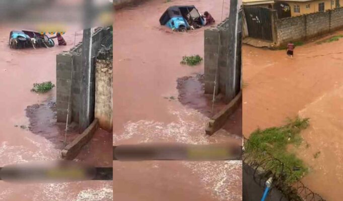 Heartbrɘaking moment a man l0ses his Keke Napep in floodwaters at Asaba, Delta State (WATCH)