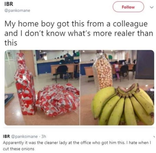 My home boy got this from a colleague and I don’t know what’s more realer than this. Apparently it was the cleaner lady at the office who got him this. I hate when I cut these onions. My home boy was close to tearing up.
