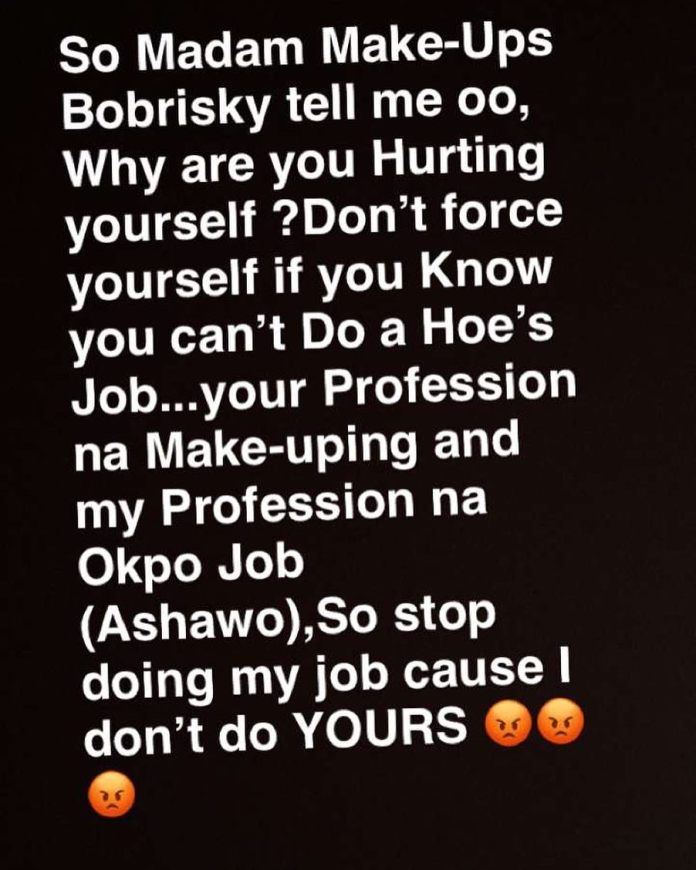 He wrote; “So Madam Make-ups Bobrisky tell me oo, Why are you hurting yourself? Don’t force yourself if you know you can’t do a hoe’s job.. Your profession na make-uping and my profession na akpo job (Ashawo), So stop doing my job cos i don’t do yours”
