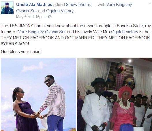 A Facebook User, Ala Mathias has shared on His Facebook page, a story of a couple who got married recently in Bayelsa State after they had met on Facebook six years ago.