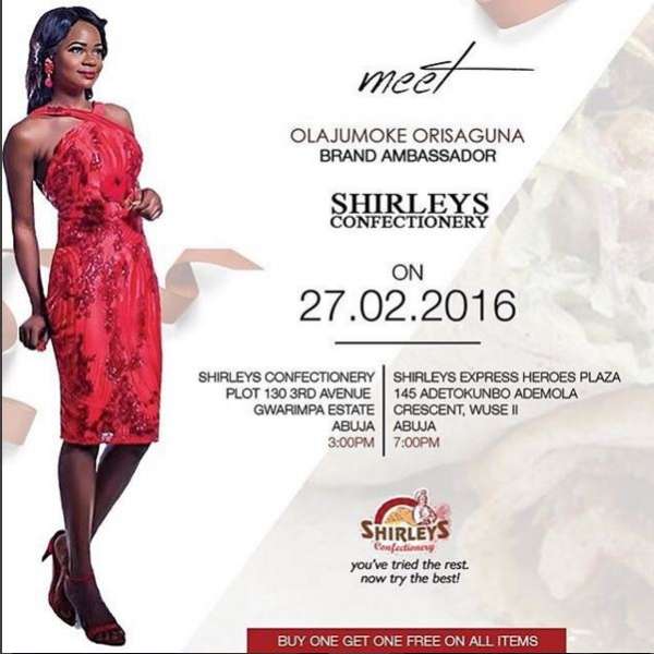 Jumoke is also the latest ambassador for Shirley’s bakery in Abuja. She will be unveiled tomorrow at Gwarimpa in Abuja, Guess that’s where she’s heading.