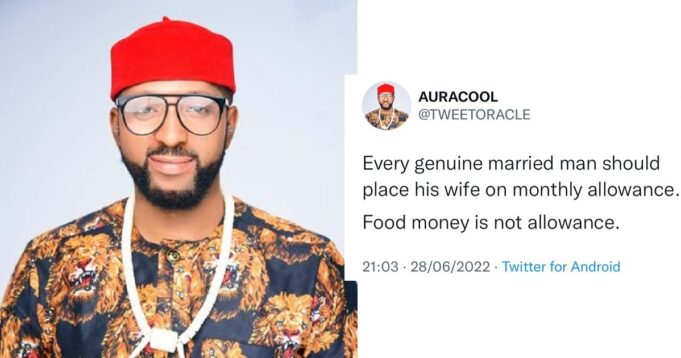 Nigerian media personality, Auracool has taken to micro-blogging platform, Twitter, to advise all married men to place their wives on a monthly allowance.