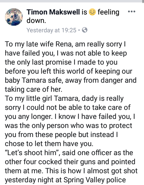 A young Kenyan father, Timon Makswell has shared a heartbreaking Facebook post after his little daughter was allegedly forcefully taken from him by his late wife’s family.
