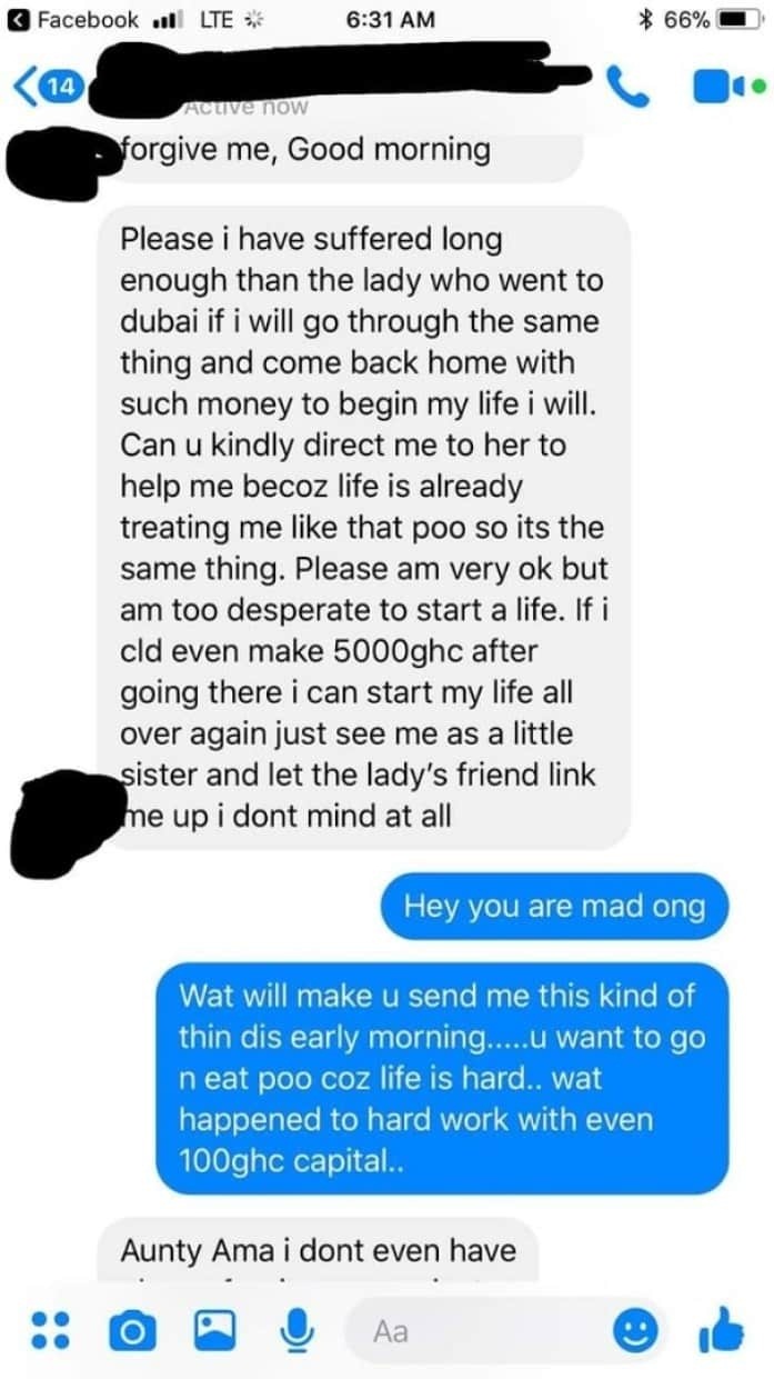 In a leaked chat from a Facebook group, Mummihood, a desperate member wants to travel to Dubai and eat the sh*t of rich Arab men for money because her life in Ghana is no different from sh*t.