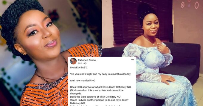Patience Otene, a Nigerian evangelist who shares the gospel of Christ on Facebook, has announced that she has welcomed a child out for wedlock.