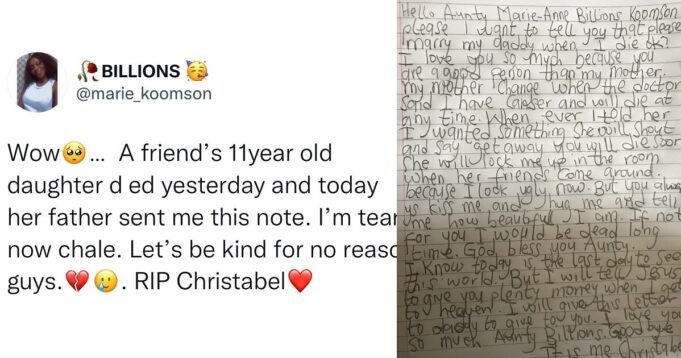 A little girl who lost a battle to cancer has melted heart on social media with a letter she left for her Father’s female friend who was by her sick bed and comforted her through the period of her sickness.