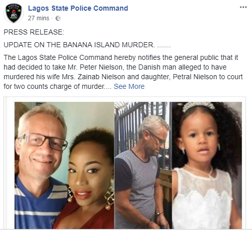 The Lagos State Police Command hereby notifies the general public that it had decided to take Mr. Peter Nielson, the Danish man alleged to have murdered his wife Mrs. Zainab Nielson and daughter, Petral Nielson to court for two counts charge of murder.