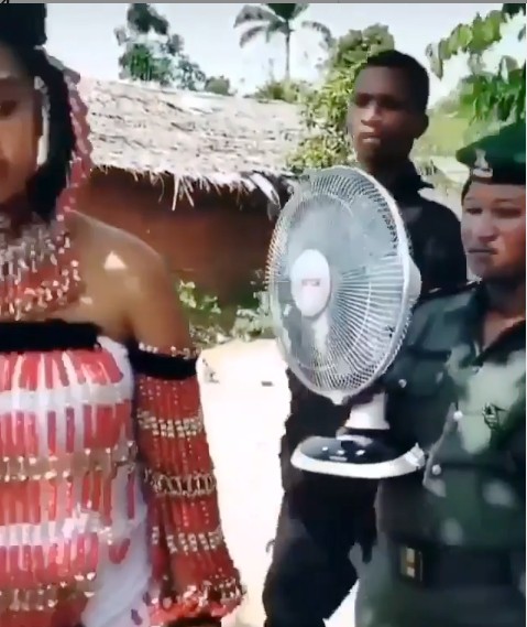 Here is a video of Regina Daniels on set of a movie shoot with her police escort who is seen holding a functioning electric fan positioned to her face.