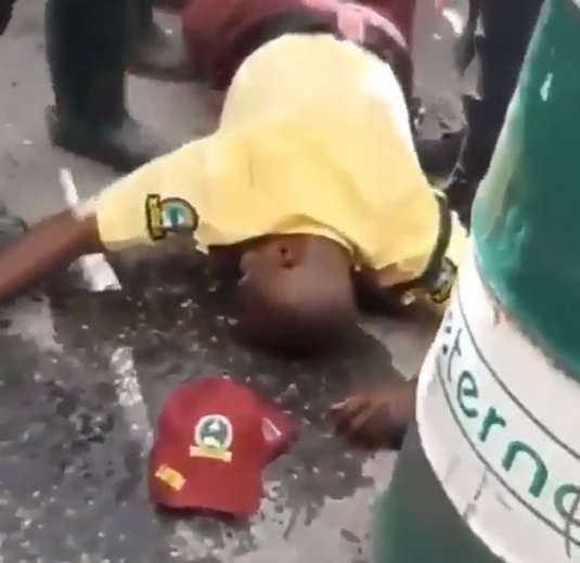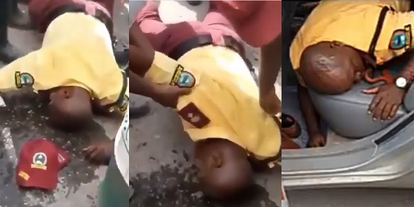 In the video which is fast going viral, the LASTMA official could be seen laying unconscious on the ground while surrounded by some security operatives and an FRSC official who was attempting to revive the LASTMA official.