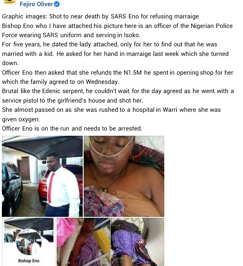 She almost passed on as she was rushed to a hospital in Warri where she was given oxygen. Officer Eno is on the run and needs to be arrest.”