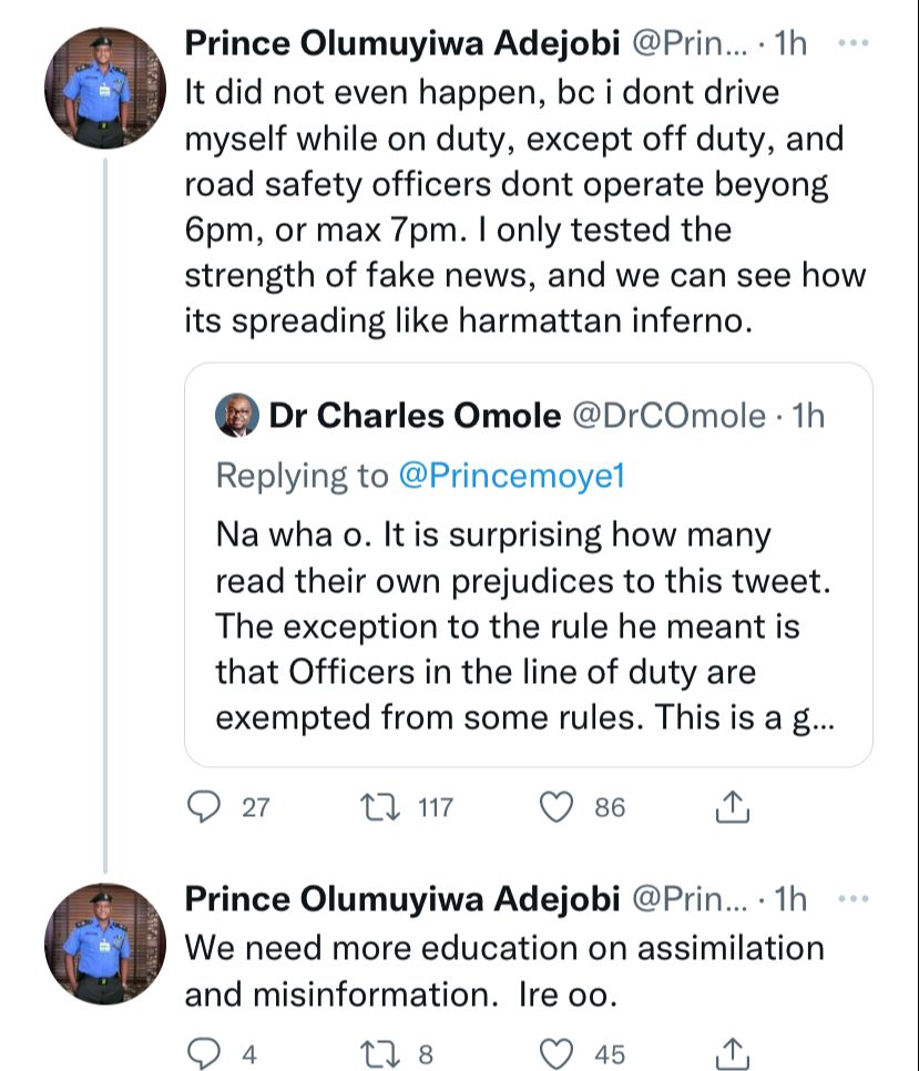 He wrote, “It did not even happen, bc i dont drive myself while on duty, except off duty, and road safety officers dont operate beyong 6pm, or max 7pm. I only tested the strength of fake news, and we can see how its spreading like harmattan inferno.”