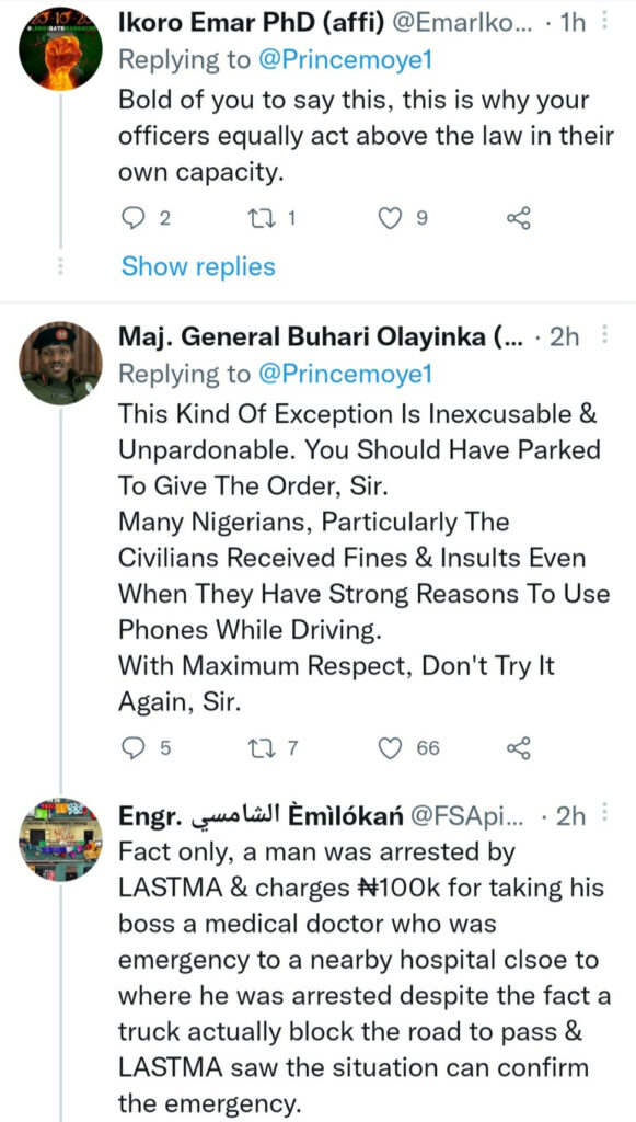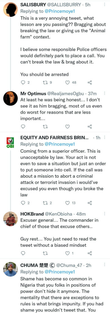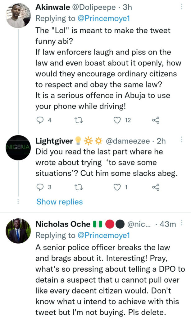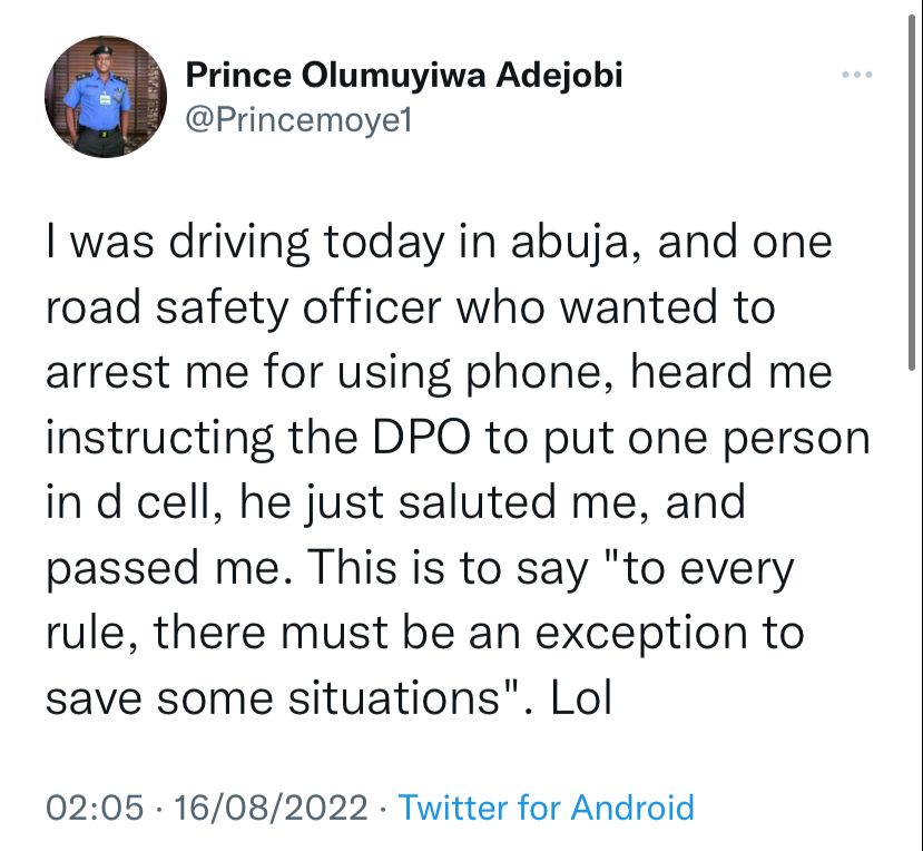 “I was driving today in abuja, and one road safety officer who wanted to arrest me for using phone, heard me instructing the DPO to put one person in d cell, he just saluted me, and passed me.