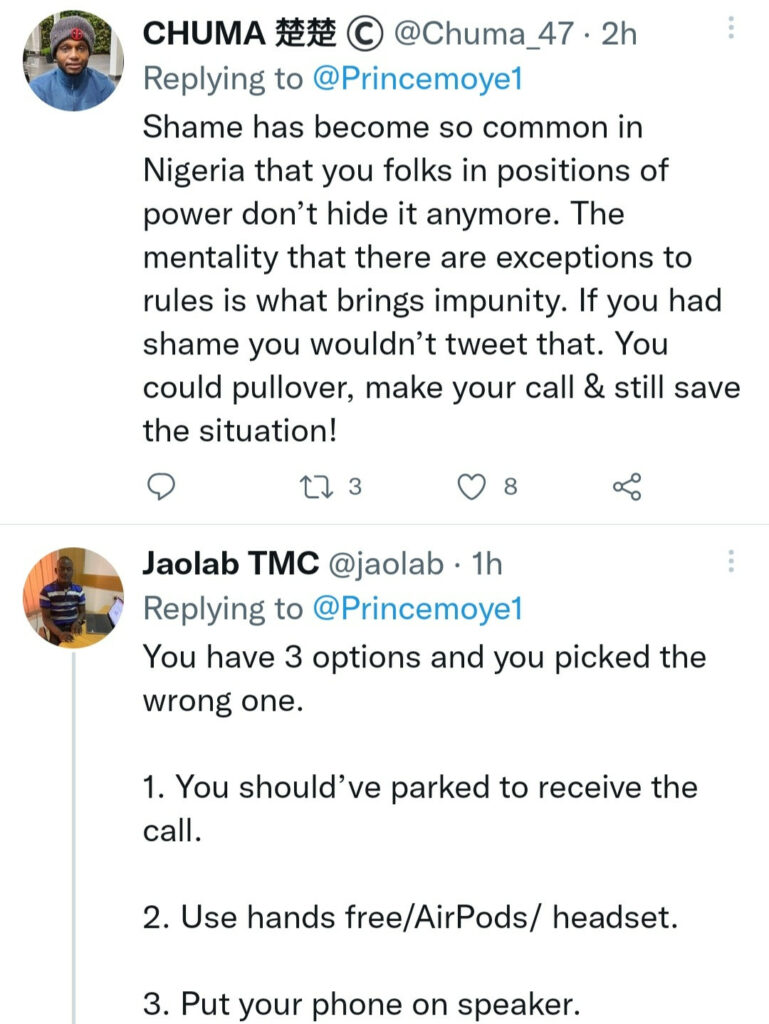 Taking to Twitter on Tuesday, August 16, Prince Olumuyiwa Adejobi disclosed that he was driving and receiving a call in Abuja, when a road safety officer stopped him and threatened to arrest him for using his phone while driving.