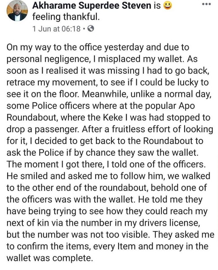 A Nigerian man has taken to social media to share a story of how some police officers returned his lost wallet back to him.