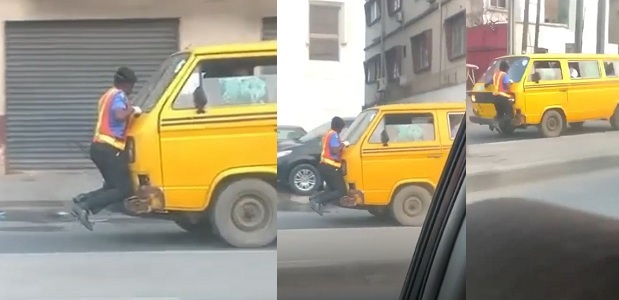 Here’s a viral video of a policeman clinging to the bonnet of Danfo (commercial bus) after its driver sped off in Sabo, Yaba area of Lagos state.