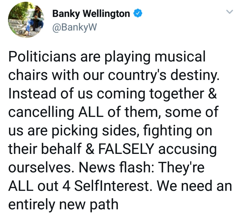 Politicians are playing musical chairs with our country’s destiny. Instead of us coming together & cancelling ALL of them, some of us are picking sides, fighting on their behalf & FALSELY accusing ourselves. News flash: They’re ALL out 4 self-interest. We need an entirely new path