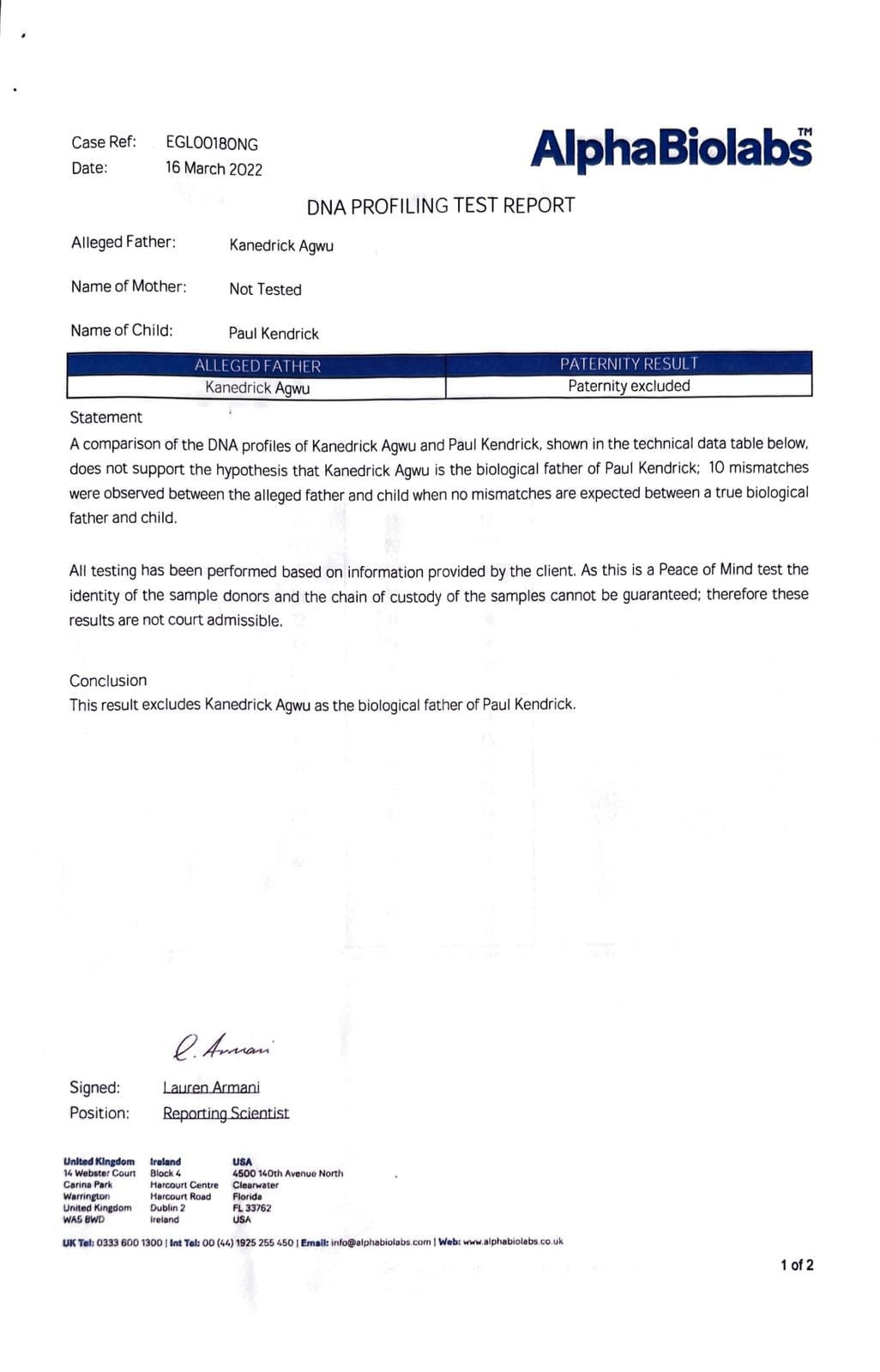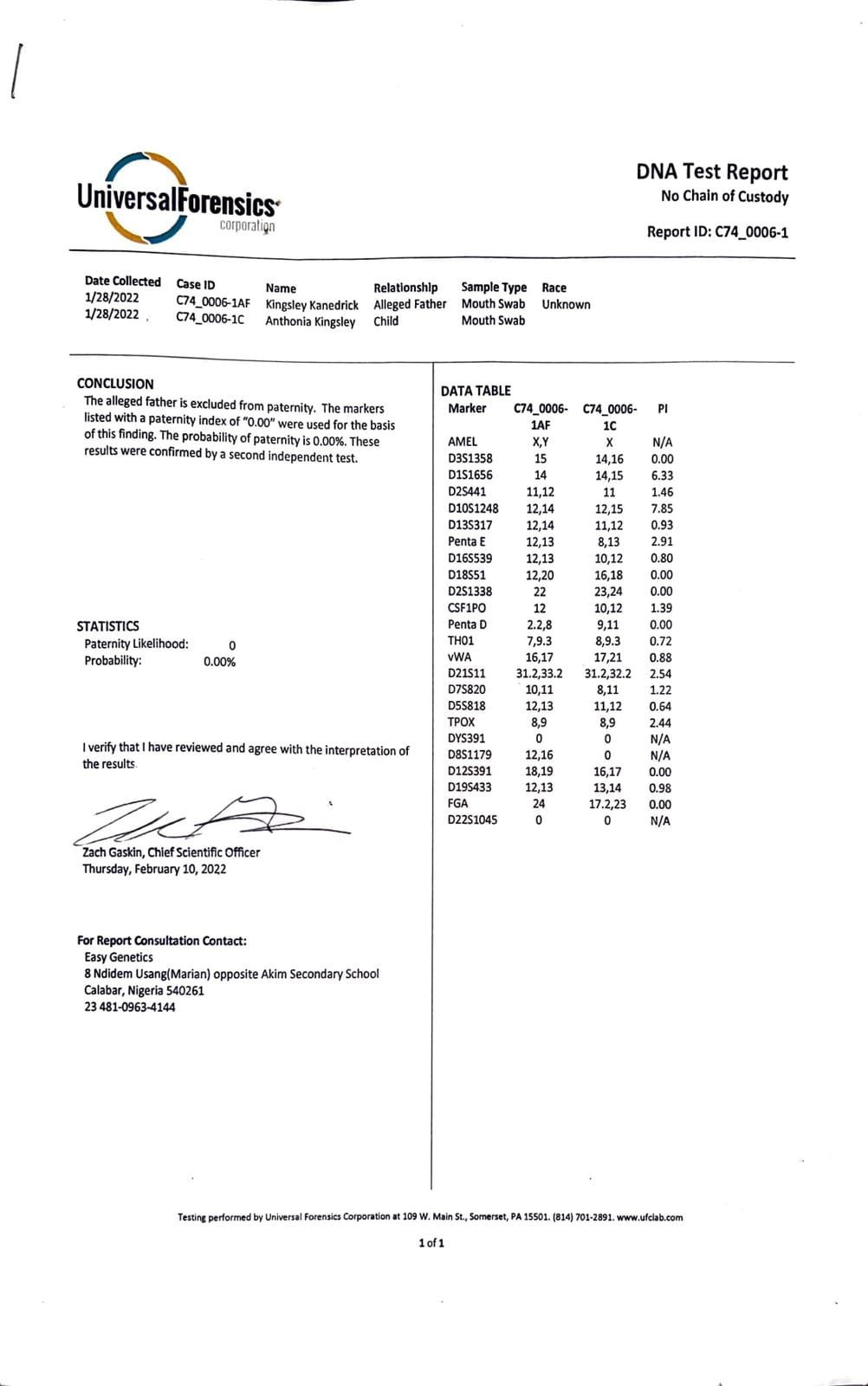 Attached here are the copies of DNA and court affidavit to further ascertain my claims. MaryAnn Efa and her family are free to contest the DNA results through the court where I too can legally file for damages for such allegations.”