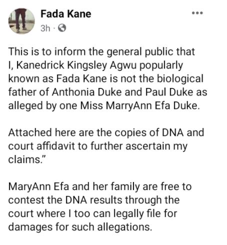 “This is to inform the general public that I, Kanedrick Kingsley Agwu popularly known as Fada Kane is not the biological father of Anthonia Duke and Paul Duke as alleged by one Miss MarryAnn Efa Duke,” he wrote.