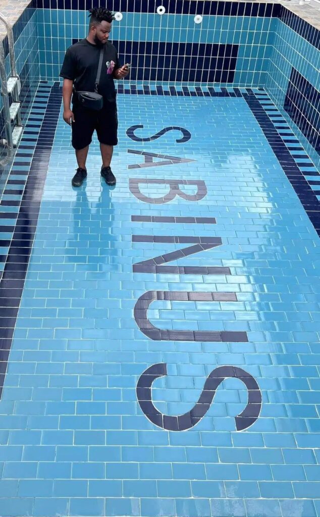 Sabinus took to his social media page to share pictures of his new home. In one of the photos, he’s seen posing inside his customized swimming pool which had his name boldly inscribed on the floor.