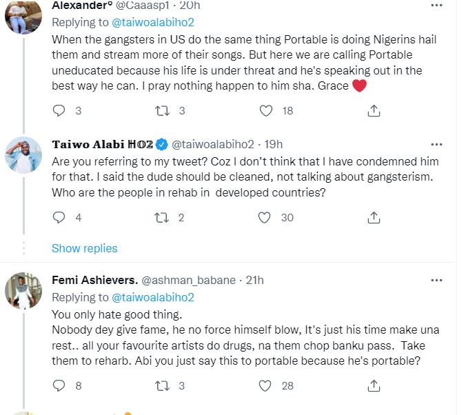 A Nigerian freelance journalist, Taiwo Alabi, has sparked debate on Twitter after he stated that fast-rising Nigerian singer, Portable, needs rehab.