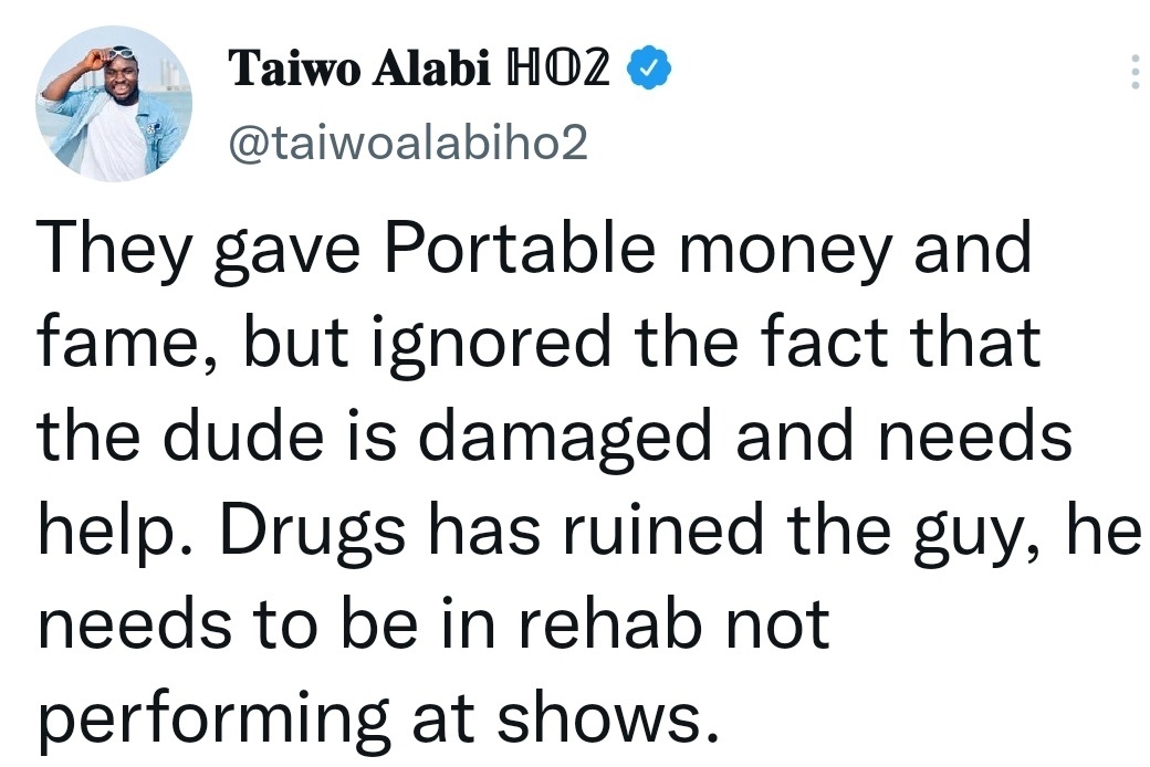 “They gave Portable money and fame but ignored the fact that the dude is damaged and needs help, Drugs has ruined the guy, he needs to be in rehab not perfiming a shows”. Taiwo Alabi tweeted.