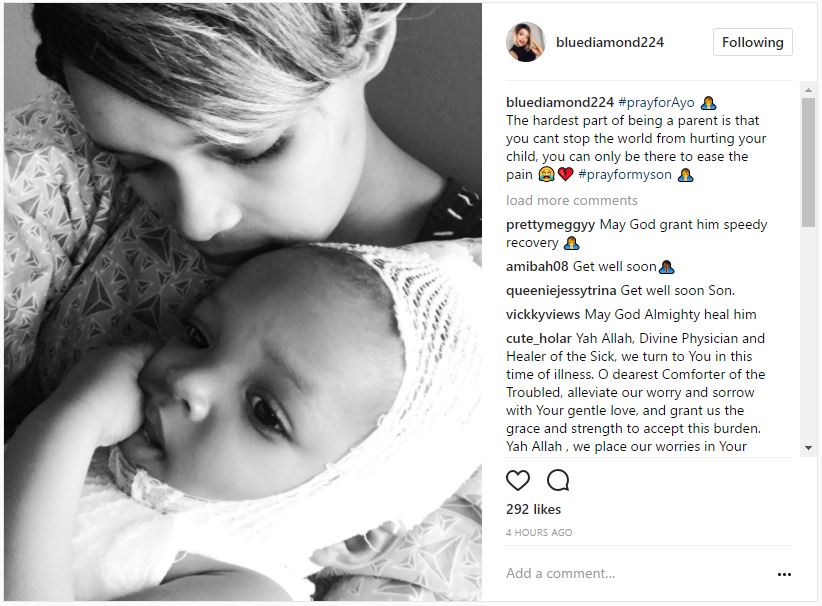Fans have become worried for singer, Wizkid’s son, Ayo Balogun Jnr, after his mother, Binta Diamond, took to her Instagram page to solicit for prayers for the one-year-old.