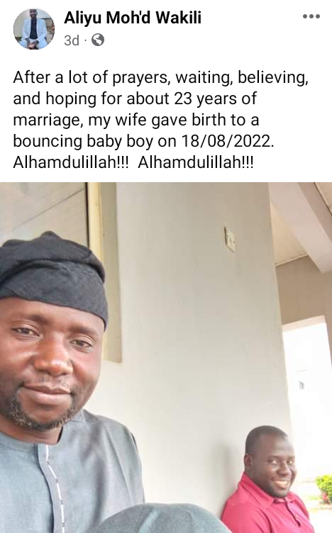 Congratulations are in order for a Nigerian man, Aliyu Mohammed Wakili, as he becomes a father for the first time after 23 years of marriage.