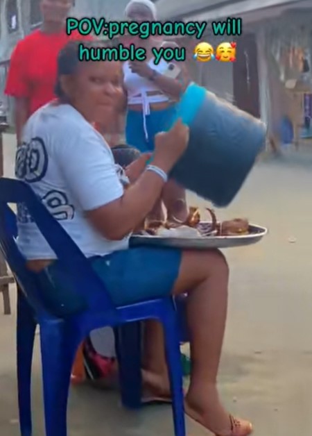 The pregnant woman sitting outside a store was seen drinking garri when she unexpectedly lifted the medium food cooler to her mouth to drink directly from the cooler.