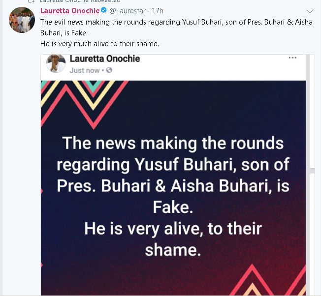 The Personal Assistant to President Buhari on Social Media, Lauretta Onochie, took to her twitter page to debunk the report saying news is fake.