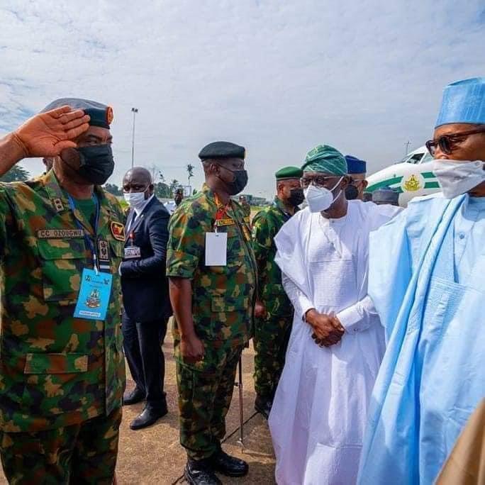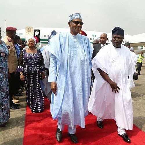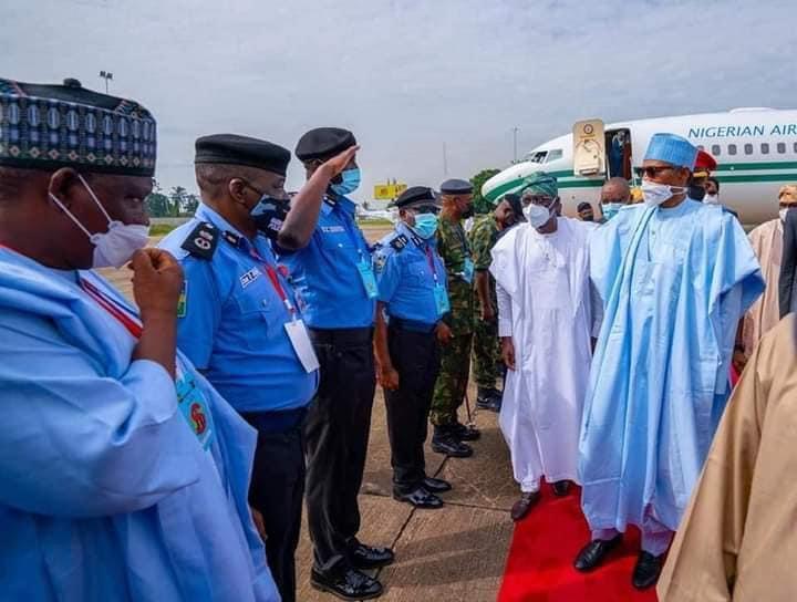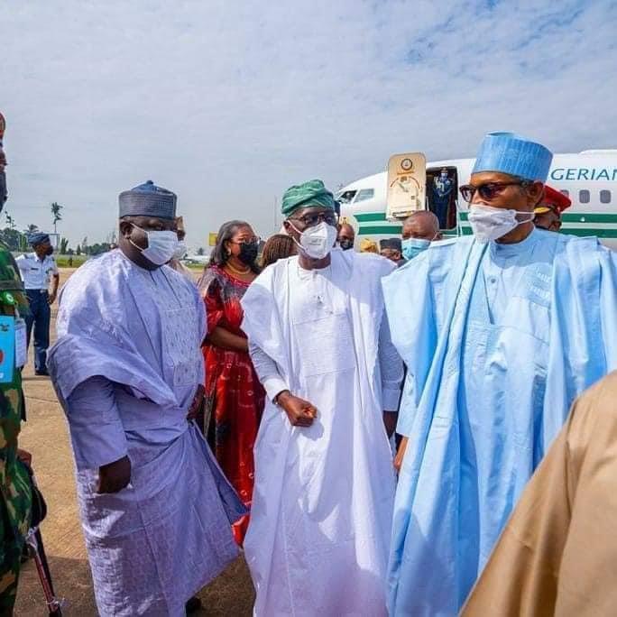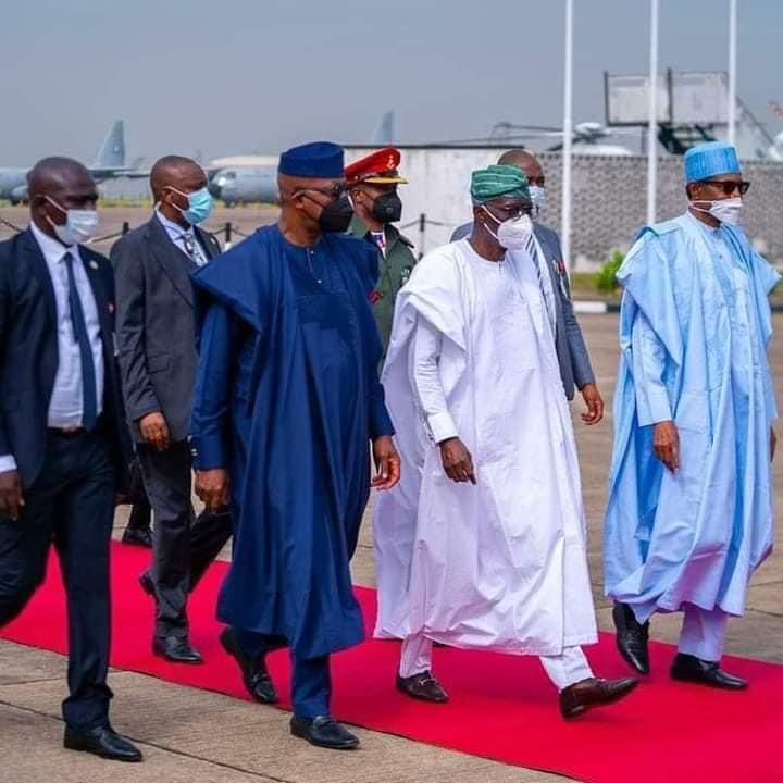 He was accompanied by the Speaker of the House of Representatives, Femi Gbajabiamila and they were both received by the Governor of Lagos state, Babajide Sanwo-Olu and other government officials.