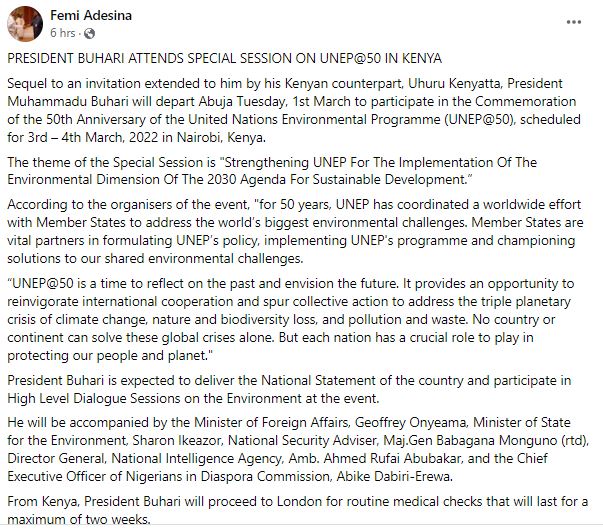 This was relayed in a statement released by the special adviser to the President on Media and Publicity, Femi Adesina, where he disclosed that the president will leave Abuja on Tuesday March 1st, to participate in the commemoration of the 50th anniversary of the United Nations Environmental Programme (UNEP@50), scheduled for 3rd – 4th March, 2022 in Nairobi, Kenya.