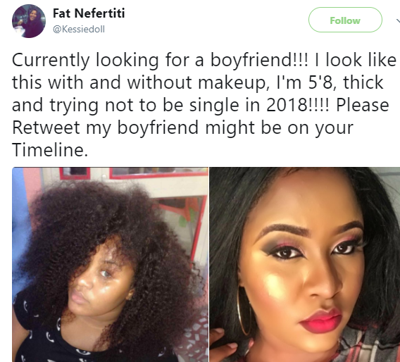 “Currently looking for a boyfriend!!! I look like this with and without makeup, I’m 5’8, thick and trying not to be single in 2018!!!! Please Retweet my boyfriend might be on your Timeline.”