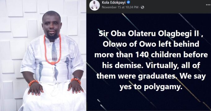 Sir Oba Olateru Olagbegi II , Olowo of Owo left behind more than 140 children before his demise. Virtually, all of them were graduates. We say yes to polygamy.