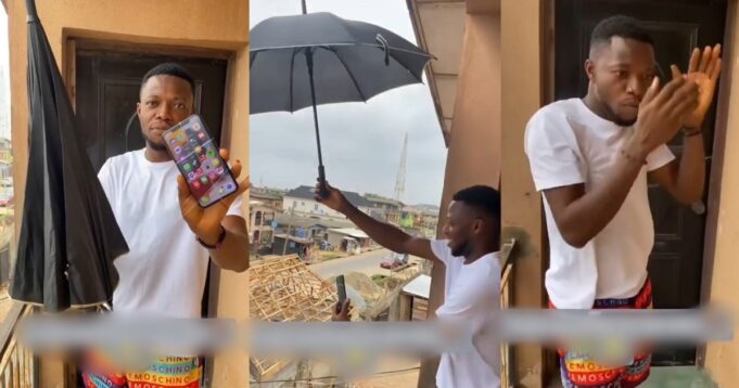 A young man has shared what happened to his expensive mobile device after he was “pushed” to participate in a parachute challenge.