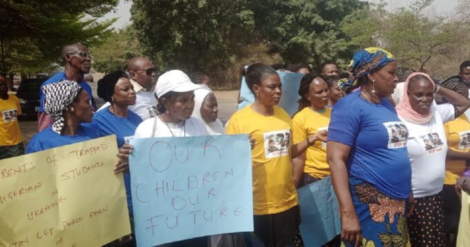 The protesters carried placards and were heard chanting songs saying “Putin, let there be peace. We are parents of Nigerians trapped in Ukraine. ”