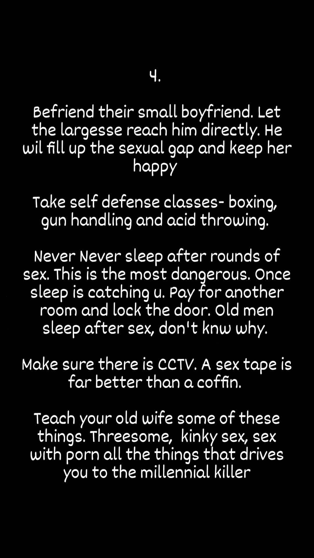 Befriend their small boyfriend. Let the largesse reach him directly. He wil .fill up the sexual gap and keep her happy Take self defense classes- boxing, gun handling and acid throwing. Never Never sleep after rounds of sex. This is the most dangerous. Once sleep is catching u. Pay for another room and lock the door. Old men sleep after sex, don’t knw why.