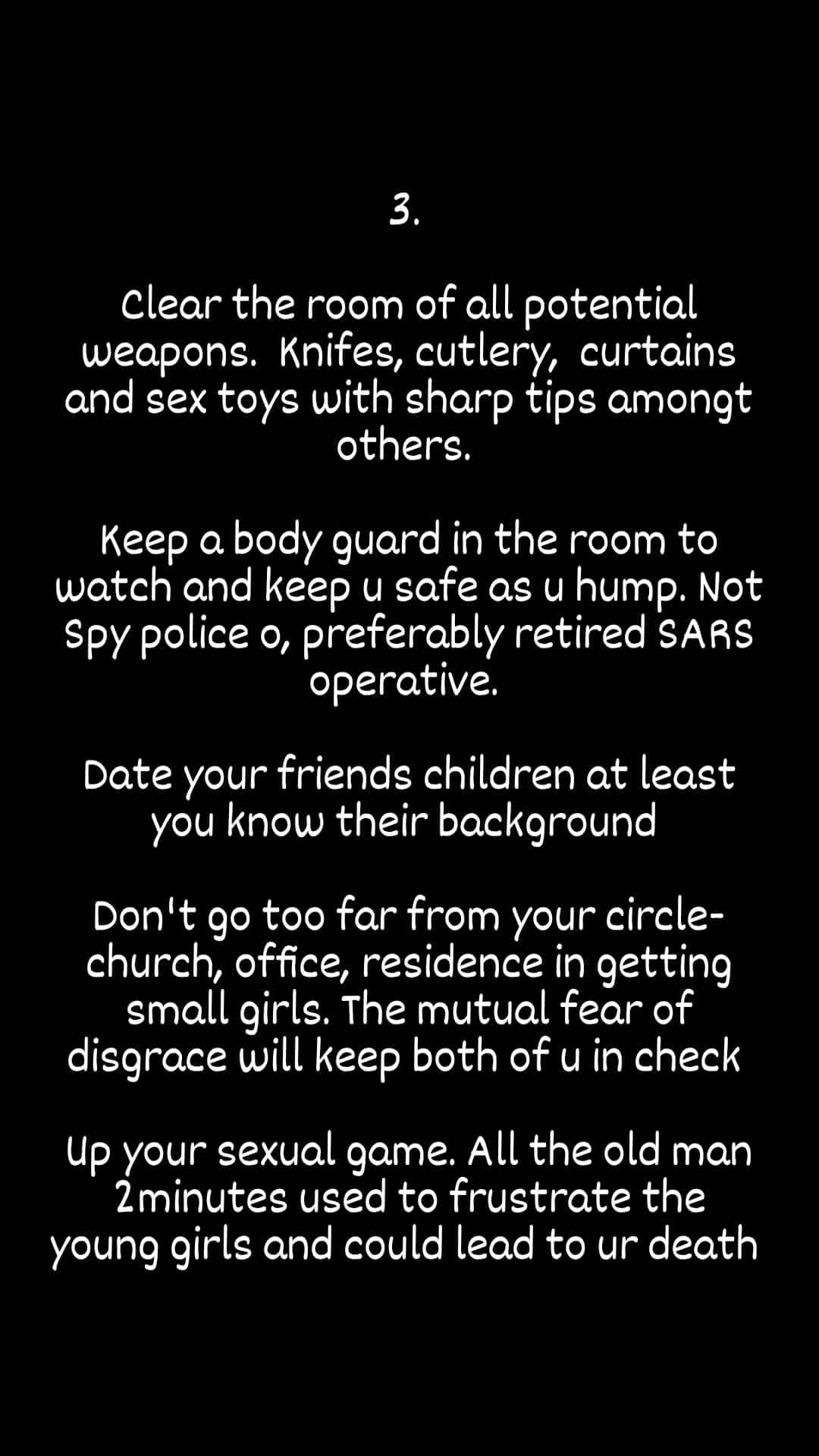 Keep a body guard in the room to watch and keep u safe as u hump. Not Spy police o, preferably retired SARS operative. Date your friends children at least you know their background Don’t go too far from your circle-church, office, residence in getting small girls. The mutual fear of disgrace will keep both of u in check Up your sexual game. All the old man 2minutes used to frustrate the young girls and could lead to ur death