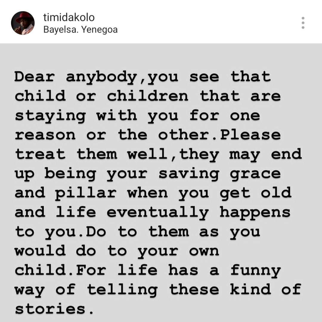 The father of three stated this after he shared a post calling on his followers who have other people’s children living with them, to ensure they treat them right as they may end up being their saving grace when they grow old.