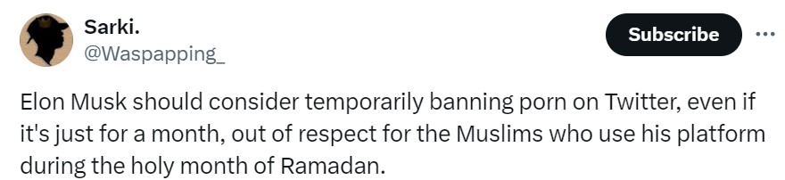 “Elon Musk should consider temporarily banning porn on Twitter, even if it’s just for a month, out of respect for the Muslims who use his platform during the holy month of Ramadan.”