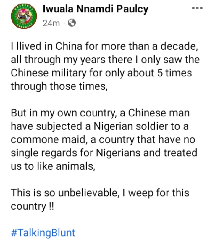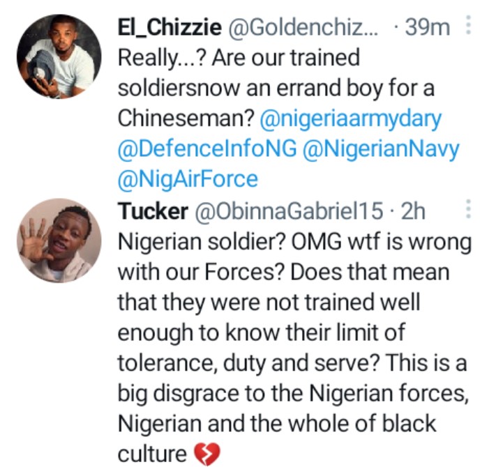 “I lived in China for more than a decade, all through my years there I only saw the Chinese military for only about 5 times through those times. But in my own country, a Chinese man has subjected a Nigerian soldier to a common maid, a country that have no single regards for Nigerians and treated us to like animals. This is so unbelievable, I weep for this country.”