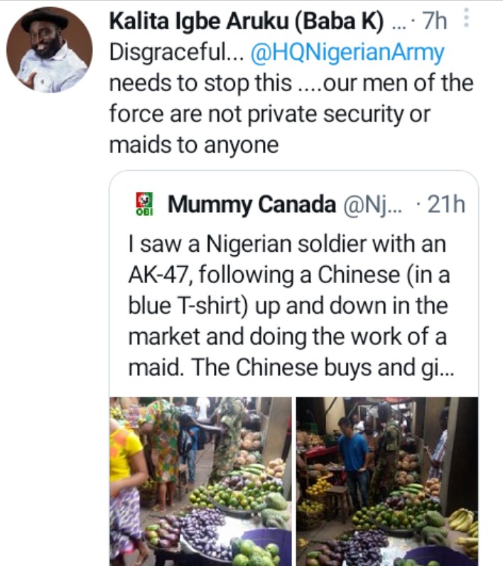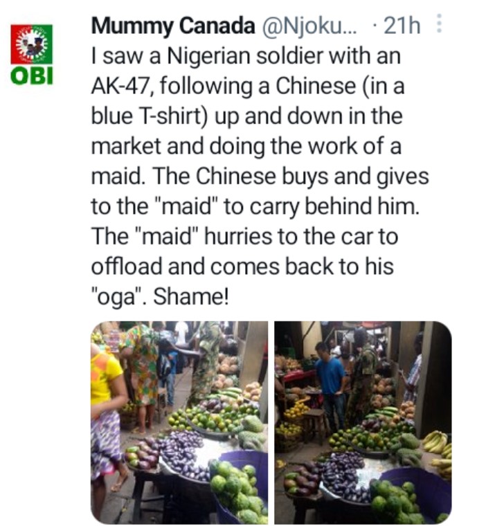 “I saw a Nigerian soldier with an AK-47, following a Chinese (in a blue T-shirt) up and down in the market and doing the work of a maid. The Chinese buy and give to the “maid” to carry behind him. The “maid” hurries to the car to offload and comes back to his “oga”. Shame!”