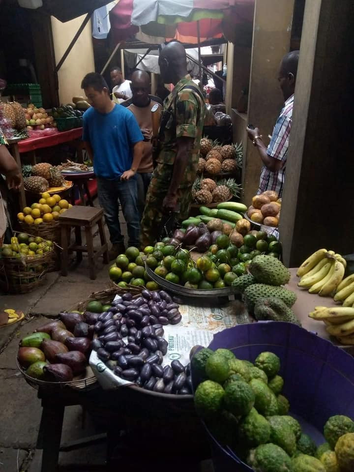 In the photos shared online by a Twitter user who spotted them at Ikosi fruit market in Ketu area of Lagos state, the soldier who was armed with an AK-47 rifle is seen with the Chinese national who was buying some fruits.