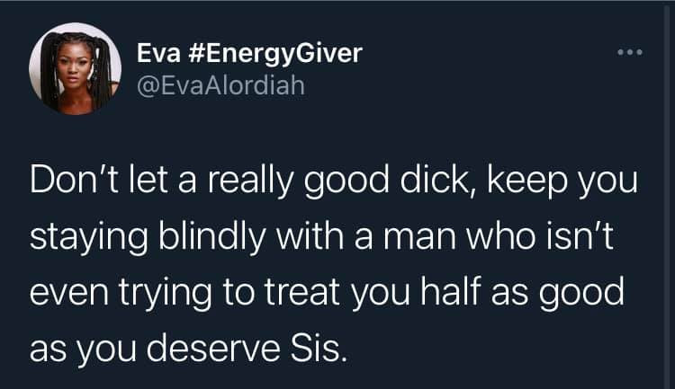 Don’t let a really good d*ck, keep you staying blindly with a man who isn’t even trying to treat you half as good as you deserve Sis.