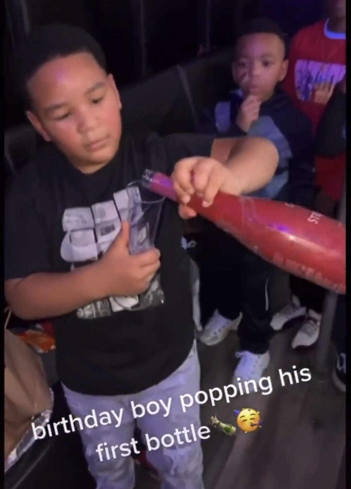 They made provisions of bottles of non-alcoholic wine so the little lads can “pop bottles” — it’s reported that cocktails were also made available at the party.